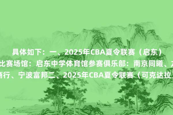 具体如下:一、2025年CBA夏令联赛(启东)比赛本领:8月8-10日比赛场馆:启东中学体育馆参赛俱乐部:南京同曦、龙狮、吉林九台农商行、宁波富邦二、2025年CBA夏令联赛(可克达拉)伊力特杯比赛本领:8月8-10日比赛场馆:可克达拉市宏远全民健身中心参赛俱乐部:新疆广汇、广东宏远、青岛国信海天、北京控股三、2025年CBA夏令联赛(库尔勒)张开剩余44%比赛本领:8月15-17日比赛场馆:库尔