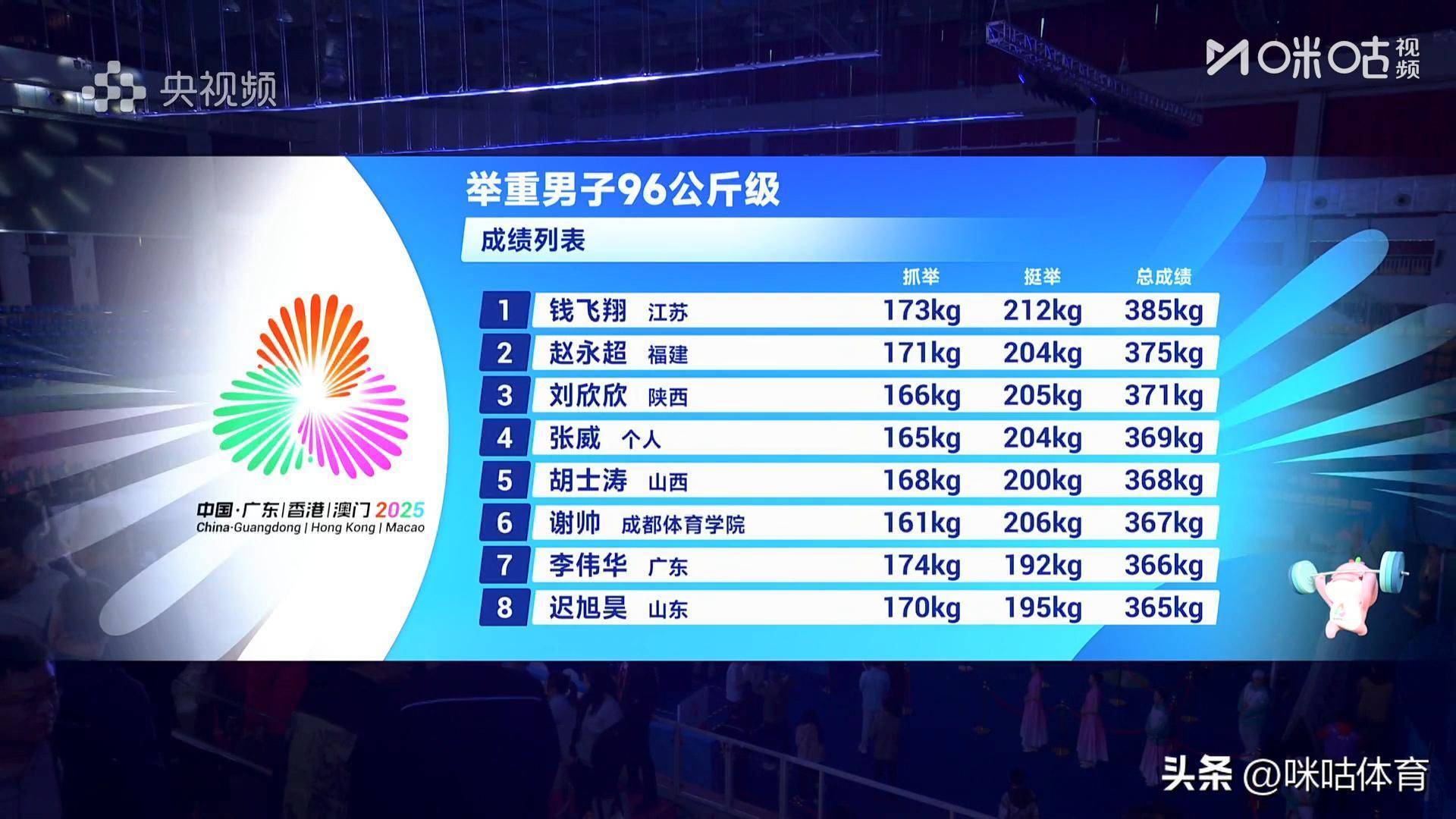 11月19日体育录像/图片,全运会举重须眉 96 公斤级决赛,江苏队选手钱飘动凭借执举 173 公斤、挺举 212 公斤、总成绩 385 公斤的超高水平发扬体育录像/图片,力压群雄斩获金牌,福建队名将赵永超以 375 公斤摘银,陕西队刘欣欣则以 371 公斤得益铜牌,三位苟且士用硬核力量为不雅众呈现了一场摄人心魄的分量对决。